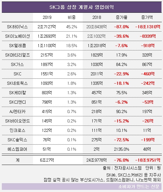 SK그룹 상장사들의 영업이익은 규모가 큰 3곳이 모두 감소했다. SK하이닉스가 87%, SK이노베이션이 39.6%, SK텔레콤은 7.6% 줄었다.