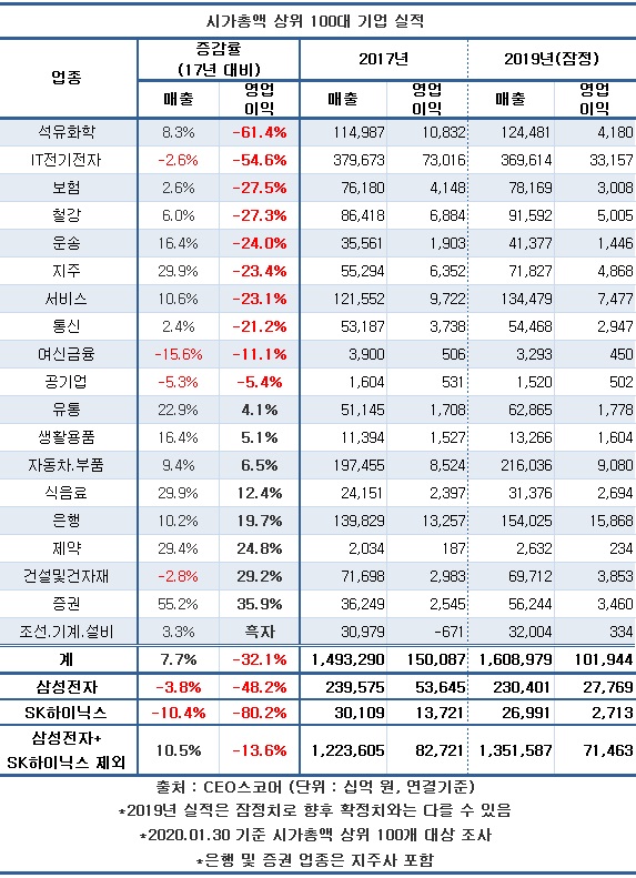 작년 시가총액 100대 기업의 영업이익은 전년보다 각각 35.9% 줄었다. 2년 전과 비교해도 32.1% 감소했다.