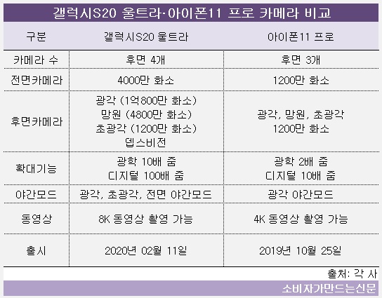 지난해 애플이 카메라 3개를 탑재한 ‘아이폰11 프로’를 출시했다면 올해 삼성은 4개의 카메라를 들고 나타났다. 갤럭시 울트라는 지난 2월 11일, 아이폰11 프로는 지난해 10월 25일 국내 출시됐다.
