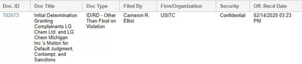 이는 지난해 11월 LG화학이 ‘영업비밀침해 소송에서 SK이노베이션이 광범위한 증거인멸, 법정모독 행위 등에 대해 조기패소판결 등 강도 높은 제재가 필요하다’고 요청한 것을 ITC가 받아들인 것이다.