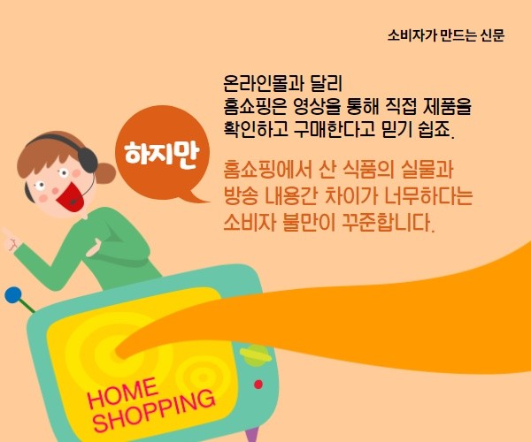 #2. 온라인몰과 달리 홈쇼핑은 영상을 통해 직접 제품을 확인하고 구매한다고 믿기 쉽죠. 하지만 홈쇼핑에서 산 식품의 실물과 방송 내용간 차이가 너무하다는 소비자 불만이 꾸준합니다.
