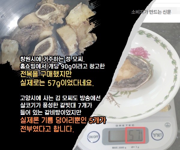 #4. 창원시에 거주하는 정 모씨. 홈쇼핑에서 개당 90g이라고 광고한 전복을 구매했지만 실제로는 57g이었다네요. 고양시에 사는 김 모씨도 방송에선 살코기가 풍성한 갈빗대 7개가 들어 있는 갈비탕이었지만 실제론 기름 덩어리뿐인 5개가 전부였다고 합니다.