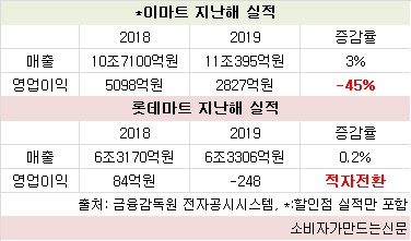 금융감독원 전자공시시스템에 따르면 이마트의 지난해 할인점부문 매출은 11조395억 원으로 전년비 3% 증가했지만 영업이익은 2827억 원으로 전년 5098억 원에 비해 45% 감소했다.