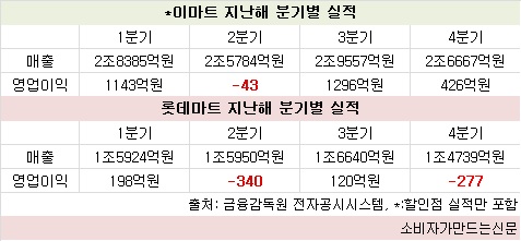 분기별로 보면, 롯데마트는 지난 2분기, 4분기 각각 영업손실 340억 원, 277억 원을 기록하는 등 실적부진 늪에서 쉽사리 빠져나오고 있지 못하고 있다.