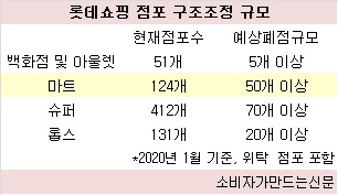롯데마트를 운영하는 롯데쇼핑은 오프라인 점포를 200여 개를 정리하겠다는 고강도 다운사이징 전략을 내놨다. 롯데마트를 포함한 전체 점포 700개 중 수익성이 없는 비효율 점포를 정리하겠다는 것. 약 30%가 정리대상이다. 현재 롯데마트는 점포수(위탁 점포 포함)는 총 124개로 3~5년의 작업기간을 걸쳐 50개 이상 폐점될 예정이다.