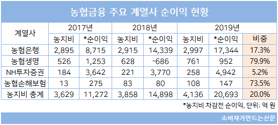 반면 매년 수익성이 큰 폭으로 향상되는 은행과 증권 계열사의 농지비 규모는 상대적으로 적었다. 지난해 순이익이 무려 1조7000억 원대를 기록한 농협은행은 순이익의 17.3% 수준인 2997억 원, NH투자증권은 5.2%에 불과한 258억 원 가량을 농지비로 납부했다.