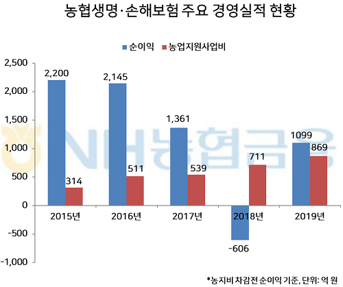 이 때문에 지난 2018년 회계연도 당시 순손실 686억 원(농지비 차감전)을 기록했던 농협생명은 연간 적자규모에 맞먹는 628억 원을 농지비 명목으로 농협중앙회에 납부했다.