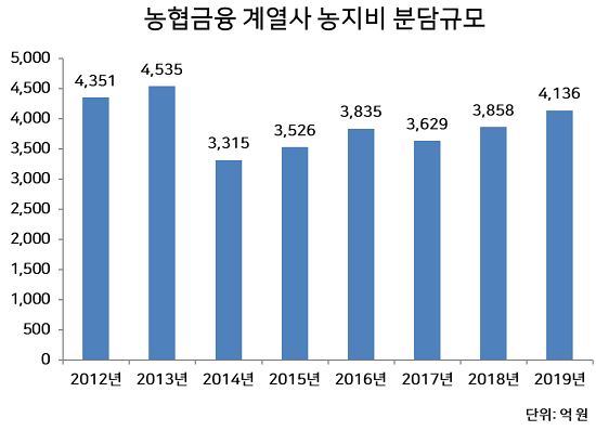 지난해 연간 기준 농협금융지주 계열사들이 부담한 농지비는 전년 대비 7.2% 증가한 4136억 원으로 지난 2013년 이후 최대 규모였다.
