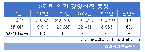 지난해 LG화학은 매출 28조6250억 원, 영업이익 8956억 원을 거뒀다. 매출은 사상 최대 규모를 기록했으나 증가율이 1.6%에 그쳤고, 영업이익은 60.1%나 감소했다. 지난해 석유화학 시황 둔화화 ESS 화재 충당금 등의 악재들이 겹친 탓이다.