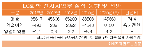 그러나 올해부터는 매출과 수익에서 급격한 성장이 예상된다. LG화학은 올해 전지사업 매출이 지난해 5조 원에서 15조 원으로 증가하고, 영업이익은 3543억 원 적자에서 6000억 원 이상의 흑자를 낼 것으로 자체 전망하고 있다. 전지사업 15조 원 매출 중에 10조 원이 전기차 배터리 매출에서 발생할 것으로 예상한다.