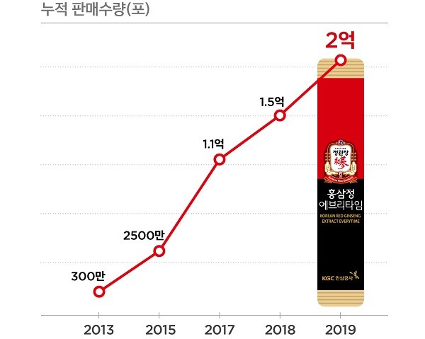 ‘정관장 홍삼정 에브리타임’은 국내산 6년근 홍삼농축액에 정제수만 넣어 휴대와 섭취가 간편하도록 만든 제품이다. 2012년 출시 후 누적 판매수량은 2013년 300만 포, 2015년 2500만 포, 2017년 1억1000만 포로 급속히 성장하면서, 2019년 2억포를 돌파했다.