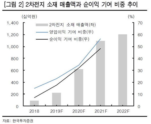 한국투자증권은 포스코케미칼의 전체 매출에서 2차전지 부문이 차지하는 비중이 지난해 15%에서 내년 45%까지 확대되고, 순이익 비중도 17%에서 48%로 높아질 것으로 전망했다.