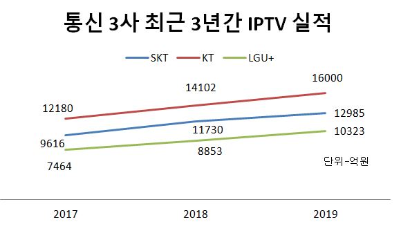 금융감독원 전자공시시스템에 따르면 KT는 지난해 IPTV서 매출 1조6000억 원을 거둬 3사 가운데 1위를 차지했다.