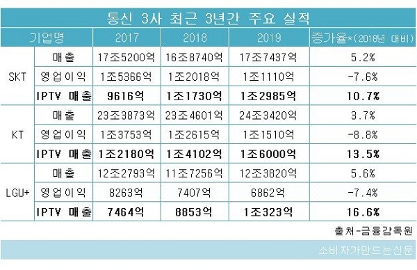 한편 통신 3사는 지난해 나란히 매출이 증가했지만 영업익은 모두 감소했다. 매출 증가폭은 LG유플러스가 5.6%로 가장 컸고, 영업이익 감소폭은 KT가 8.8%로 가장 높았다.