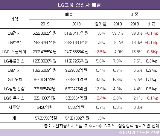 LG 상장사들 중 매출이 가장 많은 곳은 LG전자로 지난해 62조3062억 원을 기록했다. LG 상장사 전체 매출에서 LG전자가 차지하는 비중은 39.7%에 달한다. LG전자는 2018년에 이어 2년 연속 60조 원 이상의 매출을 올렸다.