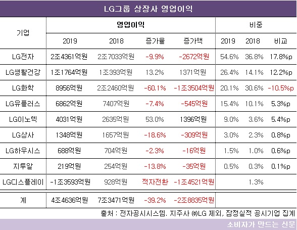 영업이익은 LG전자가 유일하게 2조 원대를 기록했다. 상장사 전체 영업이익의 54.6%에 해당한다. LG전자의 영업이익은 10%가까이 줄었지만 캐시카우 역할을 하던 LG화학이 부진하면서 그룹 상장사 전체에서 차지하는 비중은 17.8%포인트 크게 높아졌다.