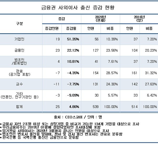 금융권 사외이사 출신별 현황을 보면 관료출신이 154명으로 전체 539명 가운데 28.57%를 차지했으며 이어 교수 131명, 금융인 127명, 기업인 56명 등의 순이었다.