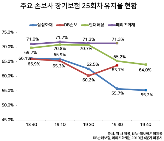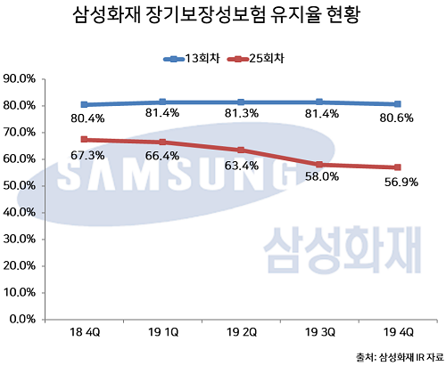 삼성화재의 장기보험 25회차 유지율은 작년 1분기에 65.9%에서 2분기 62.5%로 하락한 뒤, 3분기에는 50%대 떨어졌고 4분기에 추가 하락하며 4개 분기 연속 하락세를 보였다.