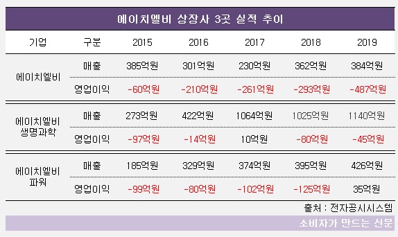 또 다른 상장사인 에이치엘비파워도 2014년부터 2018년까지 4년 연속 연간 100억 원 안팎의 적자를 냈다. 그나마 지난해 흑자전환하며 한숨 돌린 상황이다.