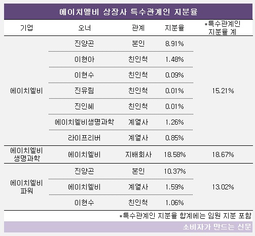 그룹의 바이오 사업을 영위하는 에이치엘비와 에이치엘비생명과학은 지배 지분이 취약하다는 공통점이 있다. 에이치엘피파워 또한 특수관계인 지분율이 13.02%에 불과하다.