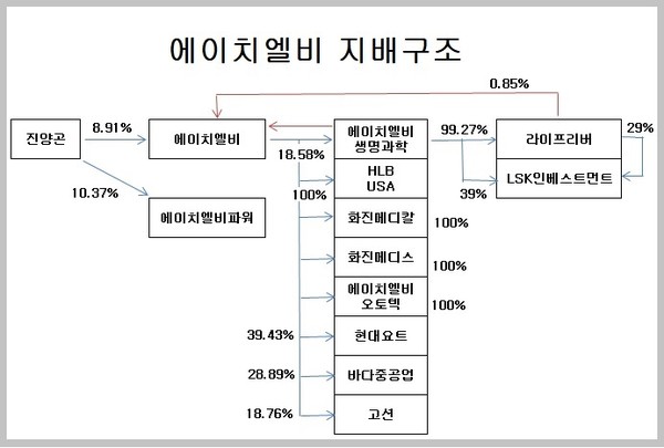 핵심계열사인 에이치엘비의 경우 최대주주인 진양곤 회장은 보유 지분율이 8.91%에 그친다. 친인척과 계열사 등 특수관계인들이 가진 지분을 모두 더해도 15.21% 밖에 안 된다. 이마저도 에이치엘비생명과학이 보유한 지분 1.26%는 상법상 상호출자에 따른 제한으로 의결권이 없다.