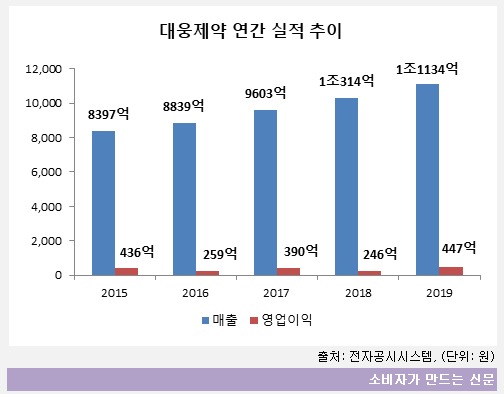 5년간 감소세를 보이던 영업이익도 지난해 개선됐다. 지난해 영업이익은 447억 원으로 전년 대비 81.90% 증가했다. 대웅제약은 2015년 영업이익 436억 원에서 2018년 246억 원으로 43.58% 급감한 바 있다.
