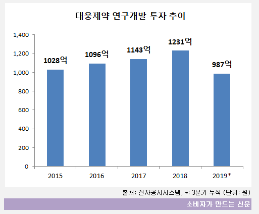 실제 대웅제약은 연구개발비로 매년 매출액의 13%가량을 쏟아붓고 있다. 2015년 투자액 1000억 원대를 넘어선 이후 2018년까지 매년 비용을 늘려왔다. 지난해 3분기까지 연구개발비는 987억 원으로, 전년 동기 887억 원에서 100억 원 증가했다.