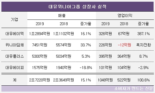 대유플러스는 2015년 416억 원을 기록한 이후 4년 만에 가장 큰 규모의 영업이익을 냈다. 대유에이텍은 영업이익이 2018년 67억 원에서 지난해 326억 원으로 387.1%나 늘었다.