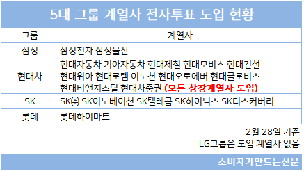 현대차그룹의 경우 올해 주총부터 모든 상장 계열사에서 전자투표제가 시행되고 SK그룹도 SK이노베이션, SK텔레콤, SK하이닉스 등 주력 계열사를 중심으로 전자투표제를 도입하는 곳이 상당수다.
