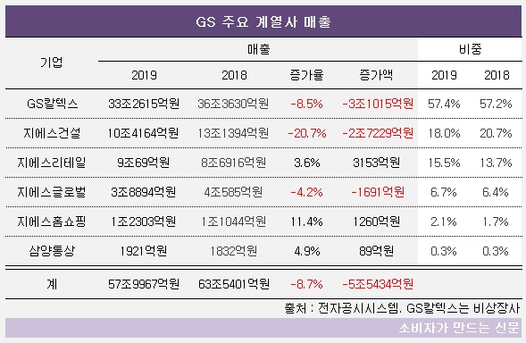 지난해 GS 주요 계열사 매출은 전년에 비해 5조5434억 원 감소했다. GS칼텍스와 GS건설 매출이 3조 원 안팎으로 줄어든 영향이 컸다. 두 곳의 매출 감소액은 5조8200억 원으로 GS 주요 계열사의 감소분보다 크다.