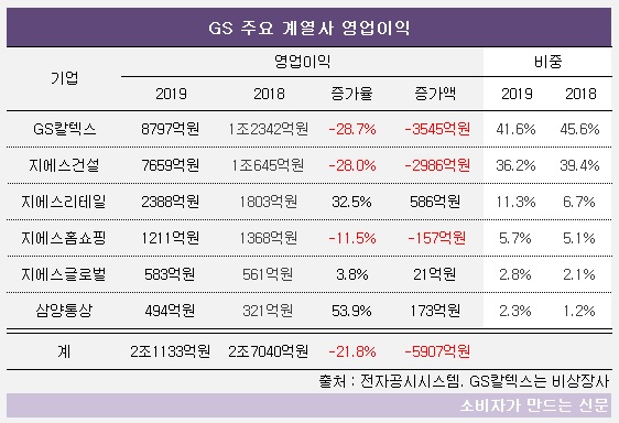 GS칼텍스와 GS건설이 차지하는 영업이익 비중도 77.9%로 높다. 2018년에는 85%로 더 높았는데 지난해 영업이익이 감소하면서 비중이 낮아졌다. 두 곳은 지난해 영업이익이 28%가량 감소했다.