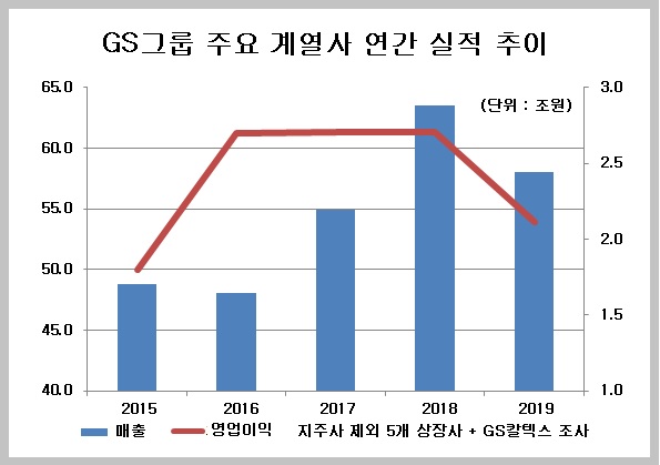 GS 주요 계열사 매출은 2016년부터 2018년까지 3년 동안 증가하며 60조 원을 넘어섰는데, 지난해 성장세가 꺾이며 다시 50조 원대로 가라앉았다. 영업이익도 2조7000억 원 안팎에서 2조1000억 원으로 대폭 줄었다.