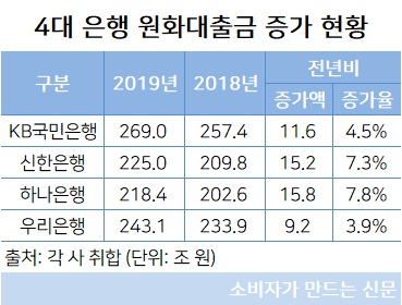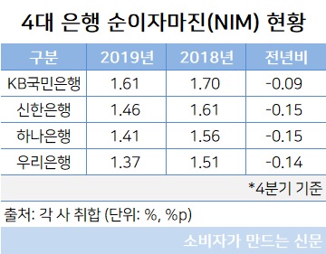 4대 은행의 지난해 4분기 기준 NIM은 KB국민은행(행장 허인) 1.61%, 신한은행(행장 진옥동), 1.46%, 하나은행(행장 지성규) 1.41%, 우리은행(행장 손태승) 1.37%로 나타났다.