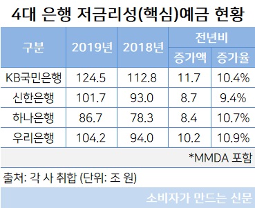우리은행의 저금리성 예금 가운데 요구불예금과 개인 MMDA(수시입출식예금)를 포함하는 ‘핵심저비용성 예금’은 전분기 대비 6.8% 늘었고 기업 MMDA도 22.6%나 늘었다. 우리은행의 저금리성 예금은 지난 2017년 93조 원, 2018년 94조 원, 2019년 104조 원 등으로 증가 추세에 있다.