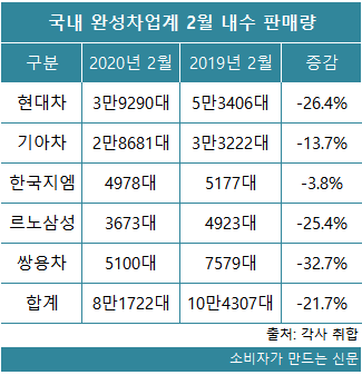 코로나19 영향으로 전시장을 방문하는 소비자들이 줄어든 데다 부품수급에 문제가 생겨 생산도 차질이 빚어졌다. 올해 설 연휴가 1월에 있었던 점을 감안한다면 더욱 뼈아플 수밖에 없다.