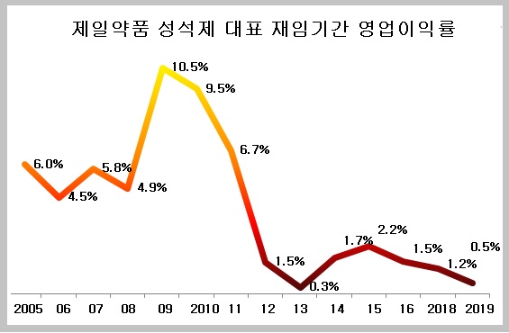 제일약품은 2005년 성석재 대표가 취임한 뒤 영업이익률을 10%를 넘기기도 했지만 이후 폭락해 최근 몇 년간 1% 안팎에 머물다가 지난해에는 0.5%로 떨어진 상태다. 성석제 대표 재임 기간에 도입약을 들여다 파는 데 치중하는 사업구조가 지속되면서 수익성을 계속 깎아먹고 있는 상황이 지속되고 있기 때문이다.