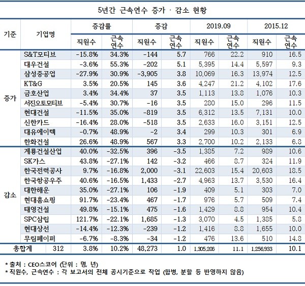 이밖에 서진오토모티브와 현대건설, 신한카드, 대유에이텍, SK건설, 서울도시가스, 풍산, 금호타이어 등도 근속연수는 3년 이상 늘었지만 직원 수는 5년 전보다 줄어들었다.