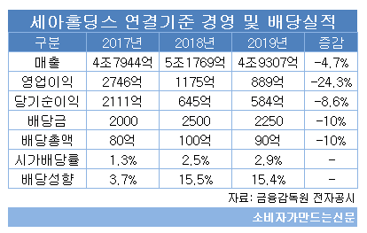 세아홀딩스는 이 같은 상황에서 주당 배당금을 2500원에서 2250원으로 250원 줄이기로 했다. 지난 2017년 영업이익 2746억 원, 당기순이익이 2111억 원이었을 때도 배당금은 2000원이었다. 2019년 영업이익 899억, 당기순이익 584억 원으로 급감했지만 2017년보다는 배당금이 오히려 높은 수준이다.