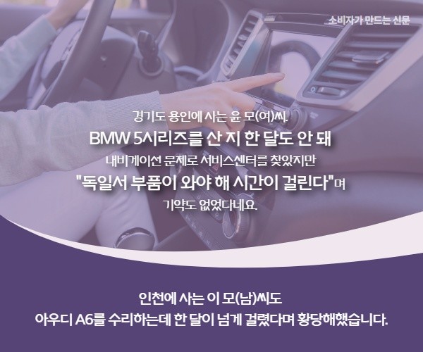 #3. 경기도 용인에 사는 윤 모(여)씨. BMW 5시리즈를 산 지 한 달도 안 돼 내비게이션 문제로 서비스센터를 찾았지만 "독일서 부품이 와야 해 시간이 걸린다"며 기약도 없었다네요. 인천에 사는 이 모(남)씨도 아우디 A6를 수리하는데 한 달이 넘게 걸렸다며 황당해했습니다.