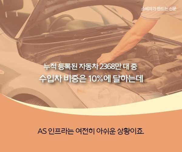 #4. 누적 등록된 자동차 2368만 대 중 수입차 비중은 10%에 달하는데 AS 인프라는 여전히 아쉬운 상황이죠.