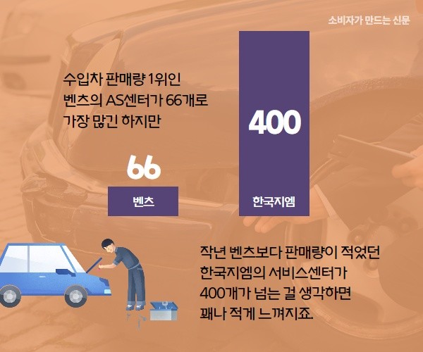 #6. 수입차 판매량 1위인 벤츠의 AS센터가 66개로 가장 많긴 하지만 작년 벤츠보다 판매량이 적었던 한국지엠의 서비스센터가 400개가 넘는 걸 생각하면 꽤나 적게 느껴지죠.