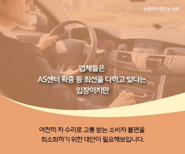 #8. 업체들은 AS센터 확충 등 최선을 다하고 있다는 입장이지만 여전히 차 수리로 고통 받는 소비자 불편을 최소화하기 위한 대안이 필요해보입니다.