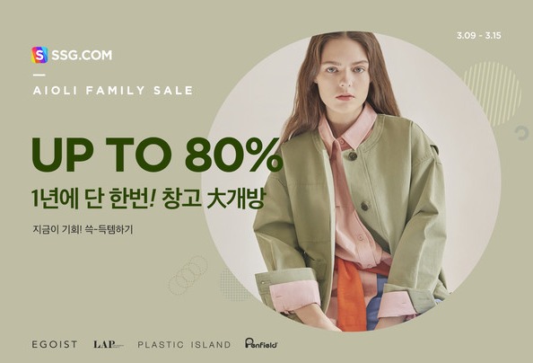 SSG닷컴은 여성복 전문기업 ‘아이올리’(AIOLI)와 오는 15일까지 일주일 간 ‘에고이스트’, ‘플라스틱 아일랜드’, ‘랩’ 등 대표 브랜드 의류를 최대 80%까지 할인하는 패밀리 세일을 진행한다고 9일 밝혔다.
