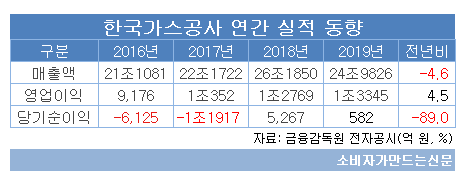 가스공사는 지난해 매출 24조9826억 원과 영업이익 1조3345억 원을 기록했다. 전년보다 매출은 4.6% 줄었고, 영업이익은 4.5% 증가했다. 문제는 당기순이익이 582억 원으로 전년도 5267억 원에 비해 88.9%나 감소했다는 점이다.