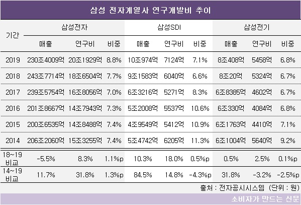 5년 전인 2014년과 비교하면 삼성전자는 연구개발비가 31.8% 증가했다. 삼성SDI도 14.8% 늘었다.