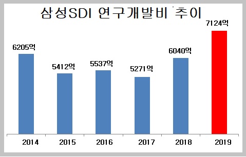 삼성SDI 역시 지난해 연구개발비가 처음으로 7000억 원대를 넘어섰다. 지난해 매출은 10.3% 증가했지만, 연구개발비 증가폭은 18%로 더욱 컸다.