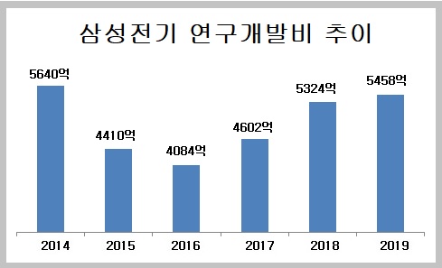 삼성전기는 연구개발비가 5458억 원으로 전년보다 2.5% 늘었다. 2014년 5640억 원에 이어 5년 만에 가장 큰 규모다. 삼성전기도 지난해 매출은 0.5% 늘었지만, 연구개발비는 2.5% 증가했다.