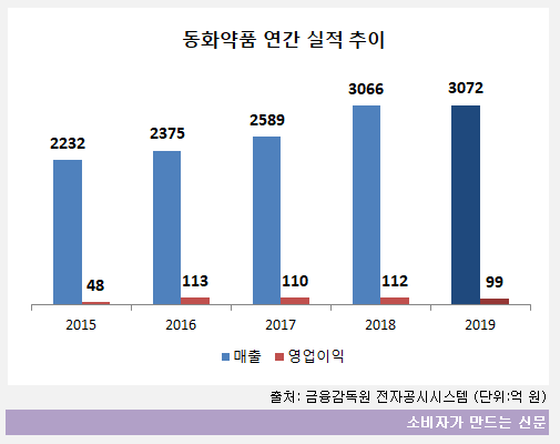 동화약품은 지난해 매출 3072억 원, 영업이익 99억 원을 기록했다. 매출은 전년도보다 6억 원이 증가하는 데 그쳤고, 영업이익은 11.7% 감소했다. 당기순이익도 6.7% 줄어든 93억 원에 그쳤다.
