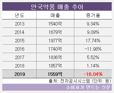 2018년 말 어진 부회장이 불법리베이트 및 불법임상시험 혐의로 검찰수사를 받으면서 기업이미지가 훼손되면서 영업에도 타격을 입은 것으로 풀이된다.