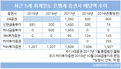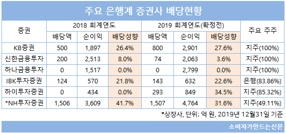2018년 10월 DGB금융지주에 편입된 하이투자증권(대표 김경규)은 전년도에 배당을 하지 않았지만 올해는 배당을 실시한다. 2019 회계연도 기준 하이투자증권의 배당액은 293억 원으로 전체 순이익의 34.5%를 배당한다. 은행계 증권사 중 배당성향이 가장 높은 것으로 지분 85.32%를 가진 DGB금융지주가 대부분을 가져갈 예정이다.